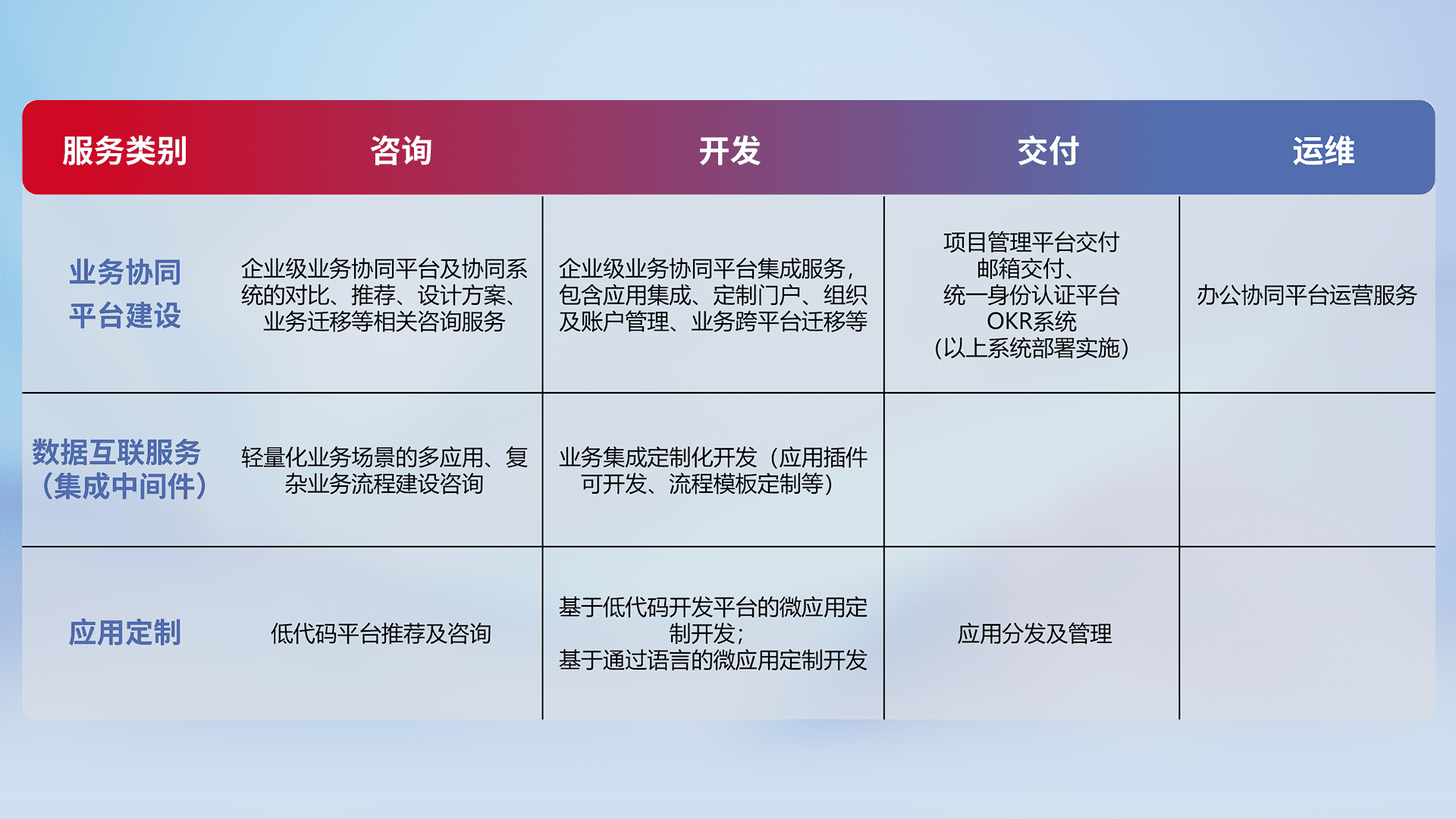 针对钉钉、、、、企微、、IDaas等平台级产品提供产品的规划、、方案、、、交付、、、、定制化开发等服务,,实现如统一协同办公、、、智能客户服务、、、、混合会议管理、、、、智能数据查询、、、等业务场景,,,实现数字化转型。。。